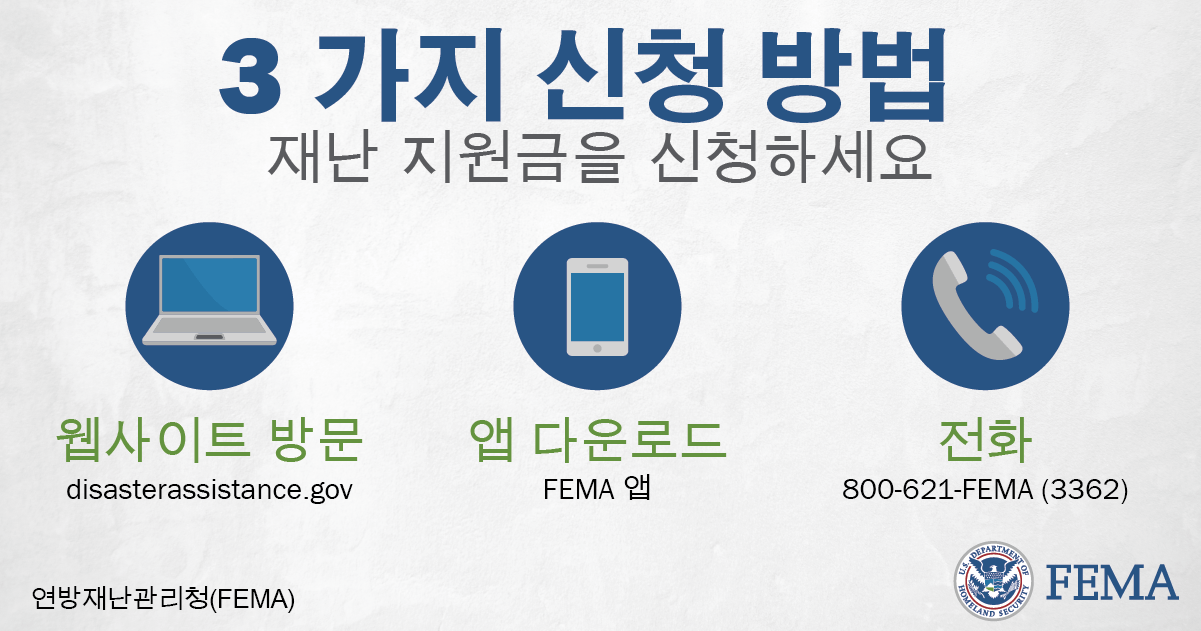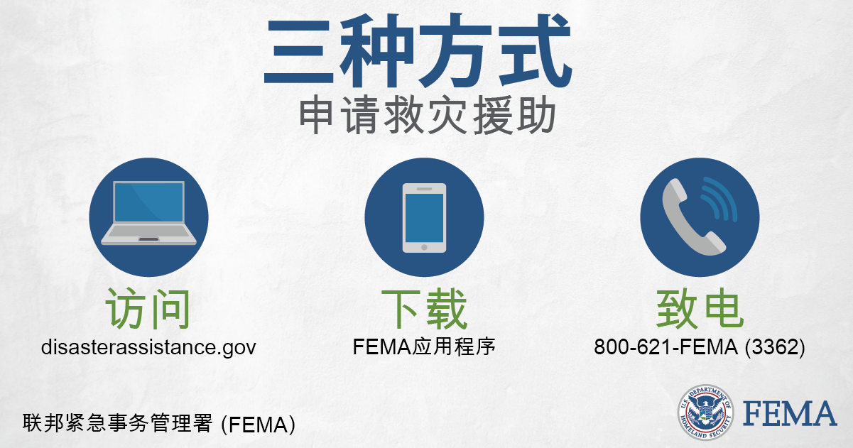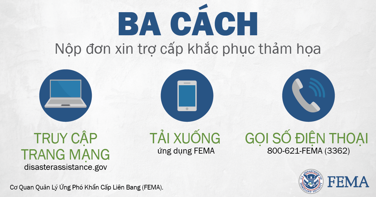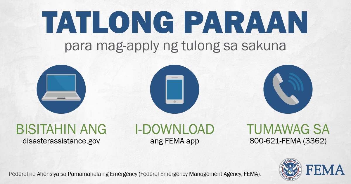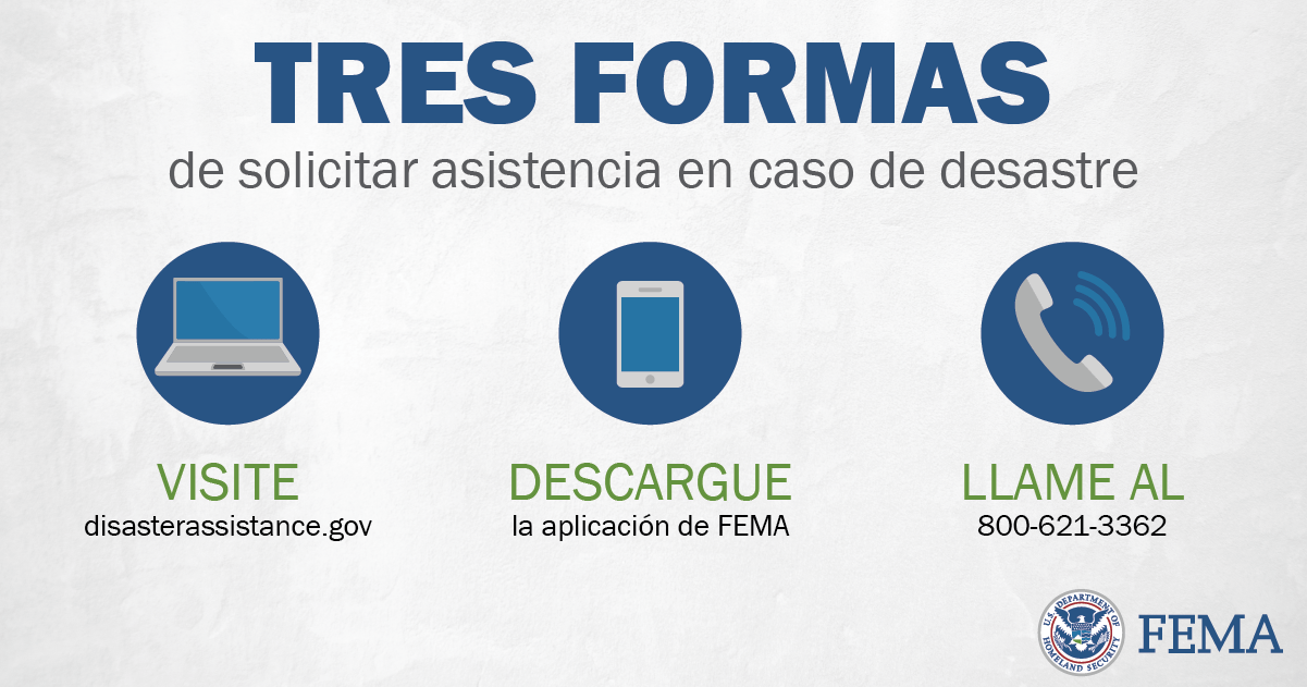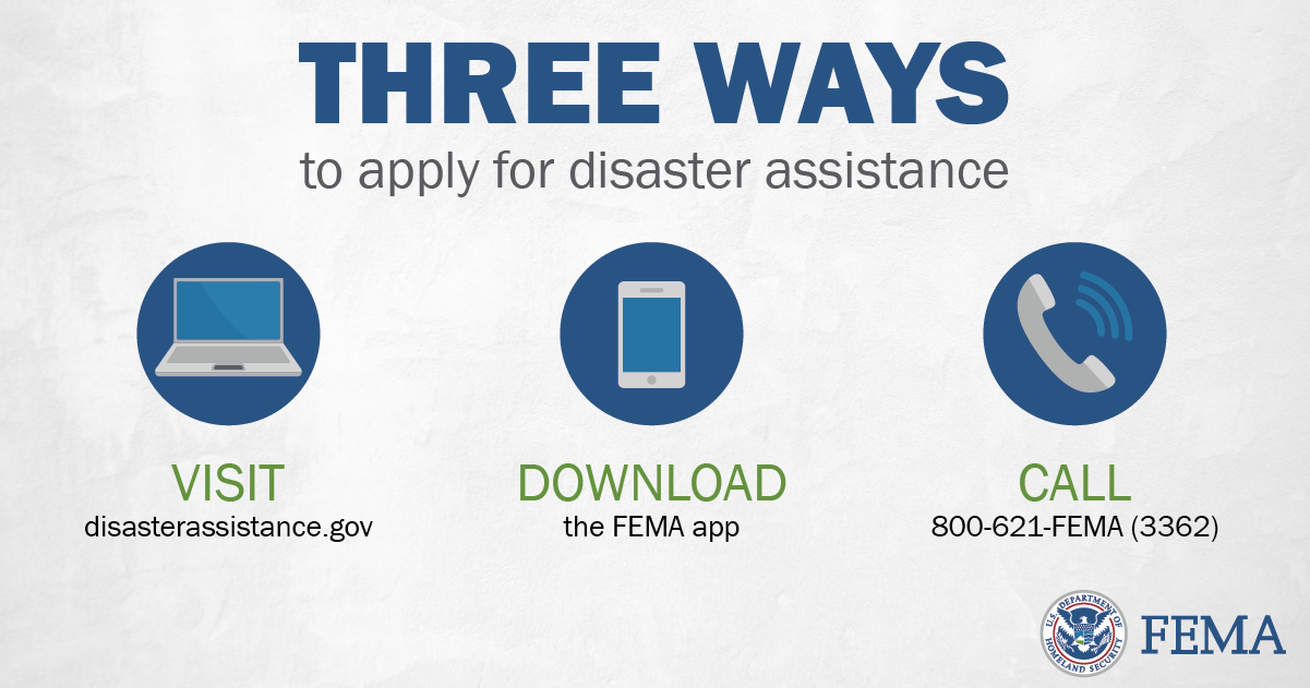 Three Ways to apply for disaster assistance. Visit disasterassistance.gov, download the fema app, or call 800-621-3362